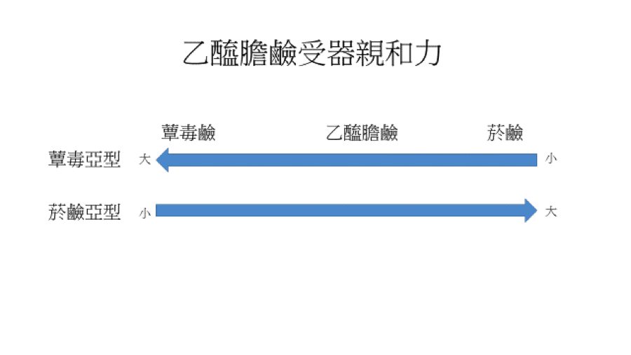 乙醯膽鹼受體依與不同化學分子有不同的親合力分成蕈毒亞型受器和菸鹼亞型受器;蕈毒型受器和蕈毒鹼有強親和力、菸鹼型則是和菸鹼有強親和力(圖二)。菸鹼型受器表現在骨骼肌以及腎上腺腺體,蕈毒型則是表現在中樞神經系統與副交感節後作用器細胞。
