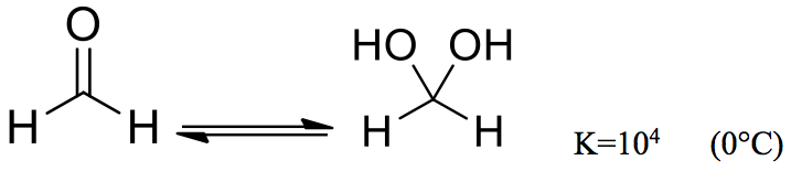 1950 年代,Iliceto、Trumpler、Bieber 等人利用其他分析方法得到甲醛水合的平衡常數 \(0^\circ C\) 時 \(=10000\),\(30^\circ C\) 時 \(=57000\),\(64^\circ C\) 時 \(=301000\)。
