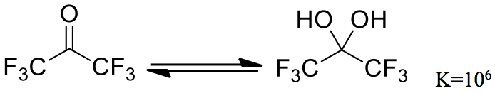 三氯乙醛的水合物比甲醛水合物更穩定,是可以分離的。其他的吸電子取代基如三氟甲基 (trifluoromethyl-) 等也有類似的效果,由兩個三氟甲基當取代基的六氟丙酮 (hexafluoroacetone),水合的平衡常數已經達到一百萬,無水物在空氣中會快速潮解(如圖四)。