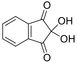 茚三酮 (2,2-dihydroxyindane-1,3-dione),一種常用於檢驗氨、一級胺、二級胺、胺基酸的化合物,以水合的形式存在。大部分的醛酮都是形成水合物後較不穩定,茚三酮發生反應的那個羰基因為周圍有兩個羰基吸電子,降低其電子密度,較容易水合形成偕二醇,穩定度反而比酮的形式還高(如圖六)。