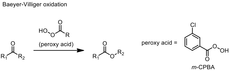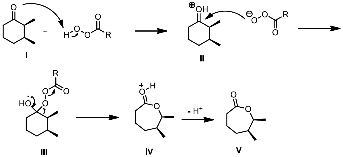 反應機構如圖六所示,以具二甲基取代的環己酮為起始物,加入過氧酸(peroxy acid,如:間氯過氧苯甲酸,3-chloroperoxybenzoic acid, mCPBA)。首先,具取代基的環己酮進行質子化,過氧酸形成去質子化分子 (deprotonated molecule),對被質子化後的中間體 (II) 進行加成,再經環上的電子轉移 (electron transfer) 得到中間產物 (IV),再經一次電子轉移,可以得到擴環的內酯產物 (V)。此反應方式源自於拜耳-維立格氧化反應 (Baeyer-Villiger oxidation)8,9 的概念,如圖七所示,拜耳-維立格氧化反應,透過過氧酸進行氧化反應,將酮類化合物氧化成酯類化合物。