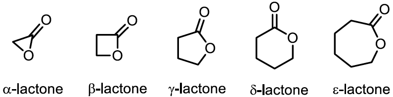 內酯 (lactone) 命名源自於酯類 (ester),為一種環形酯類,與其相像的結構還有內醯胺 (lactam),結構較為簡單的內酯命名以酯基為主體如圖一所示,以希臘字母分別表示,如圖二所示,依序為 a-lactone(三員環)、β-lactone(四員環)、γ-lactone(五員環)、δ- lactone(六員環)、ε-lactone(七員環)。