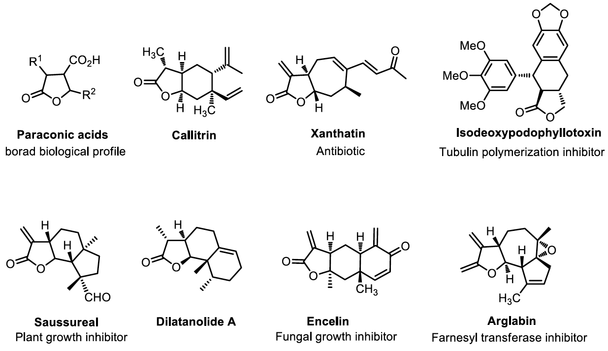 內酯廣泛存在於天然物結構中,有些具有生物活性以及藥性,如圖四為根據文獻舉例之含內酯結構之天然物。4