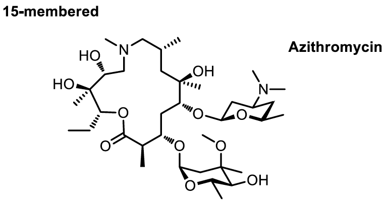 在常見的抗生素中,有很多種是含內酯結構,而這些抗生素中所含的內酯環較大,又稱之巨環內酯 (macrolide)13。已上市的抗生素中,有一稱做亞藥索黴素 (azithromycin),俗稱阿齊黴素14,結構如圖九所示。
