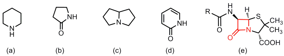 其中,於圖1(b)為內醯胺,並與另一環狀架構呈現並環結構,很多天然物含有此骨架,像青黴素 (penicillin) 圖1(e)就是一個典型的例子,而本篇文章將針對內醯胺之架構、合成方式與實際應用進行初步介紹。
