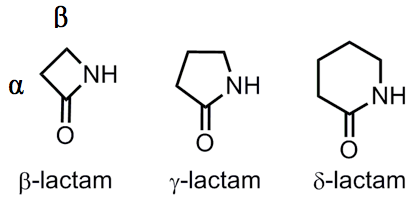 內醯胺(lactam)的命名由來是擷取內酯(lactone)和醯胺(amide)得來,即表示為環狀的醯胺。命名時以內醯胺為主體,由氮 $$\mathrm{(N)}$$ 原子為起始,以希臘字母分別表示為 $$\alpha$$、$$\beta$$、$$\gamma$$,而最小為四員環-$$\beta$$-內醯胺,依次為 $$\gamma$$-內醯胺(五員環)、$$\delta$$-內醯胺(六員環)等,如圖2所示。