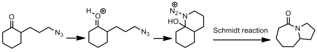 $$(1)$$ 利用帶有酮基之環狀化合物(cyclic ketones)與疊氮酸(hydrazoic acid)進行化學反應,首先酮基與路易士酸配位,疊氮經電子轉移攻打到酮基的碳上,再經由施密特反應(Schmidt reaction)進行重排,以脫去氮氣,便可得到內醯胺(如圖3所示)。[1]