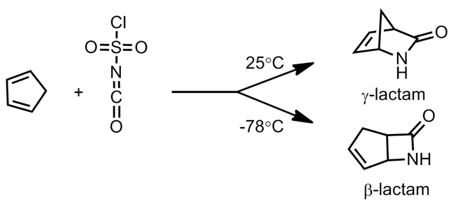 $$(2)$$ 利用環戊二烯(cyclopentadiene)與氯磺醯異氰酸酯(chlorosulfonyl isocyanate)進行狄耳士–阿德爾反應(Diels–Alder reaction):於室溫下,進行[4+2]環化反應,得到 $$\gamma$$-內醯胺;另外,在低溫中 $$(-78^\circ C)$$ 則進行[2+2]環化反應,生成 $$\beta$$-內醯胺(如圖4所示)。[2]