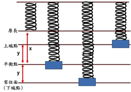 常見的彈簧振盪也能用力學能守恆解釋,假設圖二中物體質量為 $$m$$,在平衡點之速率為 $$v$$,且彈簧彈力常數為 $$k$$,其位能可分為彈力位能 $$U_s$$ 與重力位能 $$U_g$$。