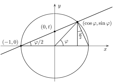 或根據正弦的二倍角公式 \(\sin{2\theta}\),得 \(\displaystyle\tan \frac{\theta }{2} = \frac{{\sin \frac{\theta }{2}}}{{\cos \frac{\theta }{2}}} = \frac{{2\sin \frac{\theta }{2}\cos \frac{\theta }{2}}}{{2{{\cos }^2}\frac{\theta }{2}}} = \frac{{\sin \theta }}{{1 + \cos \theta }}\),