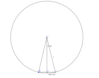 根據正弦的定義得 \(\overline {DC}=\overline {AC}\cdot \sin {11.25^\circ} = \frac{1}{2}\sqrt {2 – \sqrt {2 + \sqrt 2 } }\),