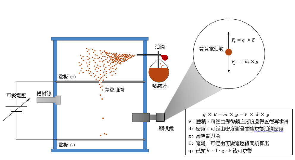 1909 年,密立根 (Robert A. Millikan, 1868-1953) 設計了著名的油滴實驗。在這個實驗當中(如圖一),密立根施加可變電壓於兩塊平行電板之間,並噴灑油滴,當油滴經過電板中間的小孔而向下墜落時,以輻射線照射使之帶電,接著密立根調控平行電板之間的電壓,使得油滴所受電力與重力達平衡,透過一旁的顯微鏡觀察,可以計算出油滴的體積,乘上油滴的密度及當時的重力場,再除以所施加的電場,就可以得知油滴的帶電量。當然,油滴並不會只帶負電,而是因為帶正電的油滴會很快地墜落到底部的負電板,因此會被顯微鏡觀察到的油滴都是帶負電且淨力平衡的油滴。密立根接著發現每一滴油滴的帶電量都是 $$1.602\times 10^{-19}$$ 庫倫 (C) 的整數倍,因此他斷言基本電荷量 $$e=1.602\times 10^{-19}$$ 庫倫 (C)。這是人類史上第一次概略地量出基本電荷的大小。隨著實驗儀器的更新及實驗方法的改良,目前基本電荷的量值為 $$e=1.602176565(35)\times 10^{-19}$$ 庫倫 (C)。