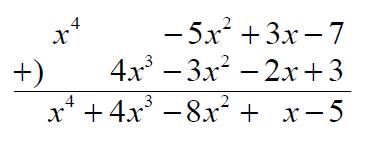 $$({x^4}-{5x^2}+3x-7)+{(4x^3-3x^2-2x+3)}$$