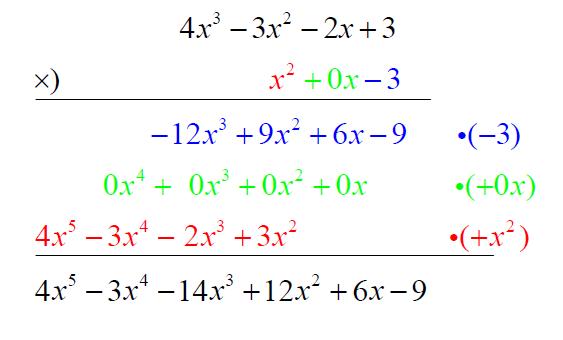 多項式之間的乘法可根據指數律操作。例如 $${4x^3-3x^2-2x+3}$$ 與 $${x^2-3}$$ 相乘,其記號和程序如下: