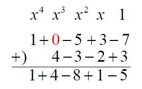 而整數的加(減)法直式計算相當於省略 $${x}$$ 不寫,只依序寫出各次項的係數(千位數、百位數、十位數、個位數)。類似地,我們也可以在多項式直式加法中,只依序寫出各次項的係數,稱之為分離係數法。採用分離係數法時必須注意,若多項式中有缺項,須用 $$0$$ 佔位,如下方紅色標示。