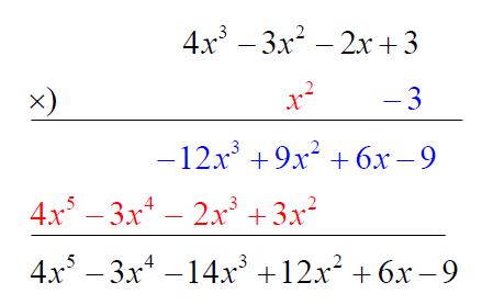 $$={4x^5-3x^4- {x^3}(2+12) + {x^2}(3+9)+6x-9}$$ (同類項合併)