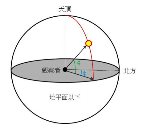 如下圖,地平座標系是以觀察者所在的地平面為基準平面,將天球分為上半球和下半球,對觀察者而言,只有上半球看得到。地平座標系使用「仰角 (altitude)」和「方位角 (azimuth)」兩個參數。仰角是指觀察者所在的地平面和天體的夾角,如圖中的 $$\theta$$。方位角是指由正北方和東方測量,天體所在的角度,如圖中的 $$\phi$$。因為地平座標系是以觀察者為參考點,隨著地球自轉,同一個星體,在不同時間,對於同一個觀察者將具有不同的地平座標。也因參考點隨觀察者而定,所以同一個星體,即使在同一時間,但觀察者不同時也會有不同的地平座標。