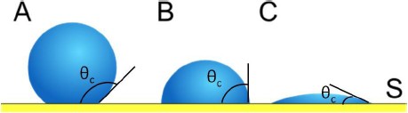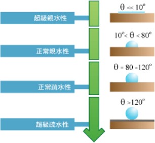 接觸角是在固體表面上,氣體──液體界面與固體表面之間,往液體方向的夾角(圖一)。利用接觸角的大小可以判斷物質表面的親水或疏水程度,接觸角愈小,物質的親水度越好(圖二)。