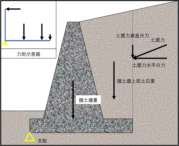 我們以擋土牆的基座前端作為考慮力矩用的支點。擋土牆後方的土會對其產生「土壓力」,那是一種類似水壓力的作用力,會根據深度和土石的密度改變壓力的大小。土壓力的水平分力會使擋土牆產生逆時針方向傾倒的趨勢;而擋土牆本身和其上方土石的重量以及土壓力的垂直向下分力會產生順時針方向的傾倒趨勢,和逆時針的趨勢抗衡。為了確保安全性,規範規定順時針力矩必須是逆時針力矩的 2 倍。 - 是否會滑動