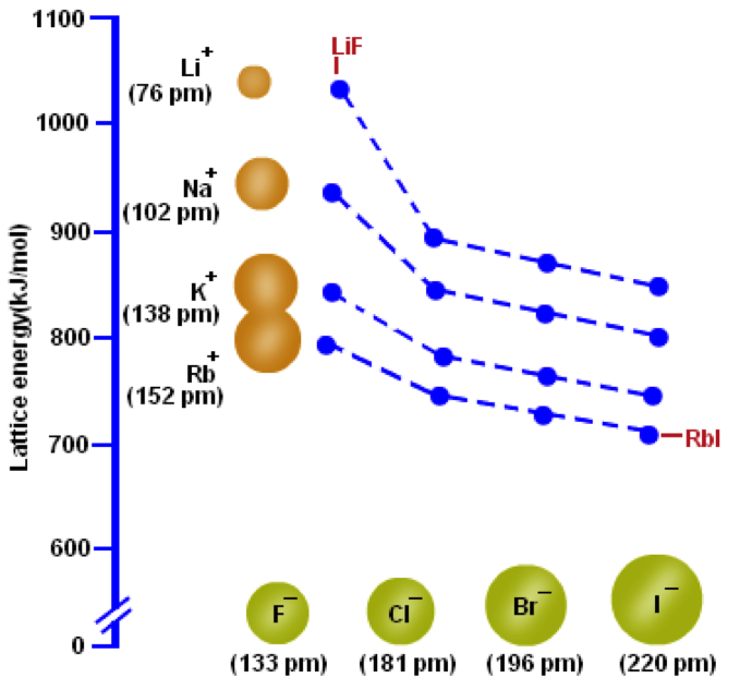 舉例來說,若以常見的鹼金屬與鹵素所形成的鹽類來比較(圖二),氟化鋰因為具有最小的離子半徑組合,晶格能最大;而碘化銣因為具有最大的離子半徑組合、其晶格能最小。