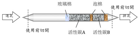 樣品分析則取前段(A)活性碳以溶劑萃取或熱脫附後由氣相層析儀進行分析。(B)段部分的活性碳則需進行穿透實驗,若採樣時間過久,或空氣污染物濃度太高,(A)段活性碳飽和後,污染物會由(B)段吸收,造成樣品分析得不準確,則必須重新採樣再分析。