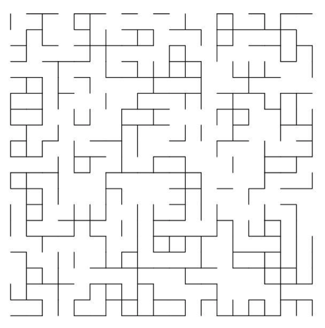 假設這些方格的每一條邊,處在開放狀態的機率都為 $$p$$。這就好像我們為每一條邊擲一次硬幣,用正反面決定它是開放的還是閉塞的。這裡,我們隨機選取一個 $$0$$ 到 $$1$$ 之間的數,如果這數小於 $$p$$,則代表這邊是開放的,反之則是閉塞的(圖三)。我們的問題是,給定距離很遠的兩個點,存在一條連接兩點的通路的機率是多少呢?