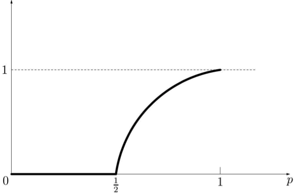 如圖四所示,假設這些格子的數目非常大,當 $$p<\frac{1}{2}$$ 的時候,滲流機率幾乎是 $$0$$!也就是說,只要 $$p<\frac{1}{2}$$,無論怎樣提高 $$p$$ 的值(即使從 $$\frac{1}{30}$$ 上升到 $$\frac{1}{3}$$,提高 $$10$$ 倍),滲流機率並沒有升高一點點。然而,當 $$p>\frac{1}{2}$$ 時,滲流機率會隨 $$p$$ 的升高而顯著上升。因此,我們稱 $$p=\frac{1}{2}$$ 為此方格模型的滲流臨界點。