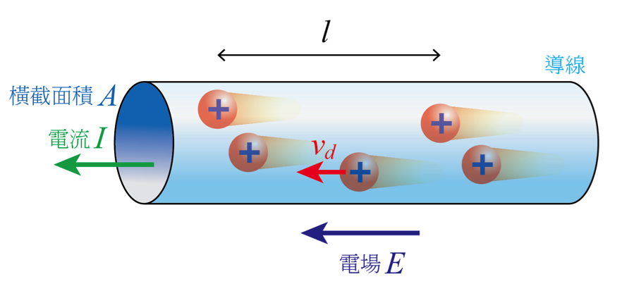 電流 $$\displaystyle I=\frac{q}{t}=\frac{nAle}{l/v_d}=nAev_d$$