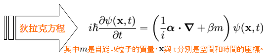 在理論物理中,相對於薛丁格方程式之於非相對論量子力學,狄拉克方程式是相對論量子力學的一項描述自旋 $$-\frac{1}{2}$$ 粒子的波函數方程式,由英國物理學家保羅‧狄拉克於 1928 年建立,不帶矛盾地同時遵守了狹義相對論與量子力 學兩者的原理,實則為薛丁格方程式的勞侖茲協變式。這條方程式預言了反粒子的存在,隨後 1932 年由卡爾‧安德森發現了正子(positron)而證實。