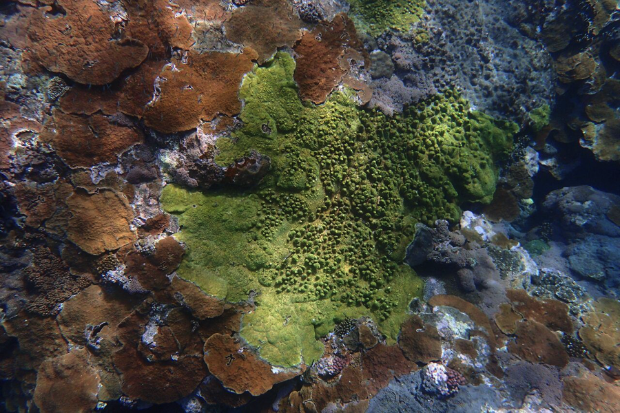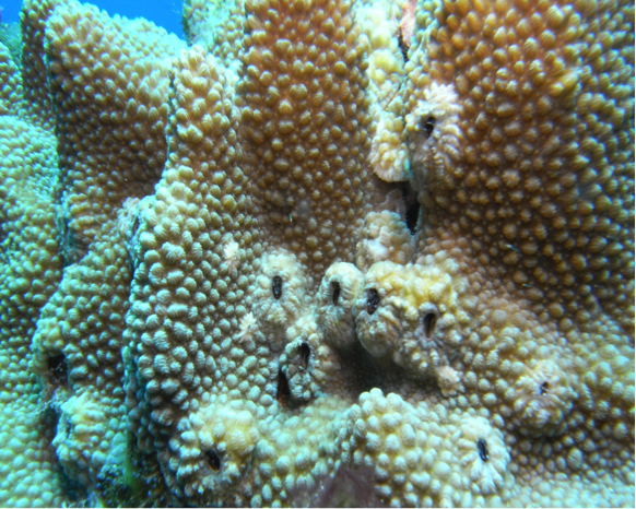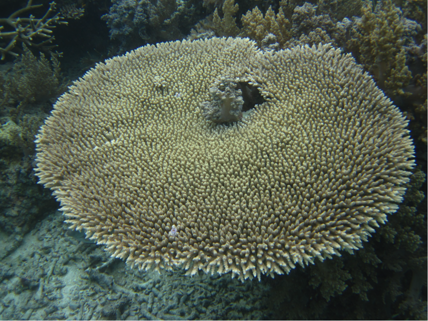 軸孔珊瑚科 (Acroporidae) 是石珊瑚種類中最多的一科,下涵 6 個屬,是最主要且最佔優勢的造礁珊瑚物種,可以說是珊瑚礁功能健全與否的重要生態指標。海邊常見的軸孔珊瑚 (Acropora)、表孔珊瑚 (Montipora) 都是本科成員。軸孔珊瑚(圖八 a)具有明顯的軸珊瑚孔與側珊瑚孔,通常會形成樹叢狀或桌面狀的群體,表孔珊瑚(圖八 b)則以扁平的表覆狀或葉片狀的型態為大宗。
