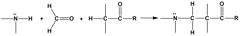 [Mannich reaction] 甲醛、胺類(通常二級胺)、與羰基化合物三者反應形成β-胺基化合物的有機反應,反應式如下:4.危險性