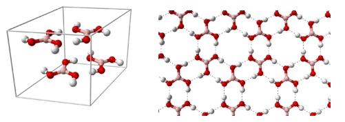 硼酸晶體是由氫鍵相連的 B(OH)3 單元組成的片層結構,相鄰兩層間的距離為318皮米(pm)。