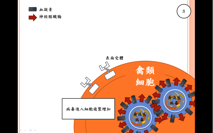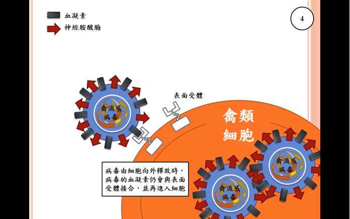 一般的流感病毒 (influenza virus) 都屬於正黏液病毒科 (Orthomyxoviridae),而該病毒總共可以分為三型:A、B 和 C。其中 B 和 C 型只會感染人類,而 A 型則廣泛分布在人跟各種動物之間。結構上,流感病毒具有八段單股 RNA、基質蛋白 (matrix protein)、核蛋白 (nucleoprotein) 以及封套 (envelope)。流感病毒的分類方法主要依據封套上的兩種具抗原性的蛋白質:血凝素 (hemagglutinin, HA) 以及神經胺酸水解酶 (neuraminidase, NA)。以 A 型流感病毒為例,至今已經發現十八型 HA 以及九型 NA,理論上可以有一百六十二種 A 型流感病毒。功能上,HA 與細胞產生連結以方便感染,NA 則打斷 HA 與細胞連結以促使病毒顆粒脫離細胞,持續尋下一個目標(圖一至圖五)。