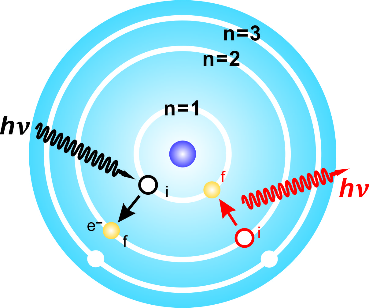 以氫原子而言,電子位於 $$n=1$$ 的能階上,此時電子的能量為最低的狀態 $$(E_1\approx{13.6}~eV)$$,稱為基態(ground state);若此電子吸收能量躍遷至較高能階時,此時位於高能階的電子則稱為受激態(excited state)。原子中的電子從能階 $$i$$ 躍遷到能階 $$f$$ 時,會放出或吸收光子,$$\Delta E=E_i-E_f$$ (如圖三所示)。根據能量守恆,其頻率 $$\nu$$ 為