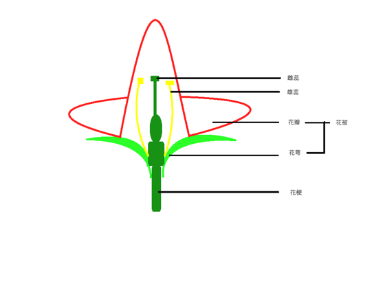 構造上,萼片的總稱為花萼 (calyx),花瓣的總稱為花冠 (corolla),而花萼及花冠合稱為花被 (perianth),為外圍包覆雄蕊及雌蕊的器官。雄蕊可分為含有花粉的花藥,以及連接花藥的花絲。雌蕊最上為受粉重要構造的柱頭,最下為子房,子房內為含有卵細胞的胚珠,胚珠在受精後發育為種子,連接柱頭與子房的構造稱為花柱。承載花萼、花冠、子房的構造稱為花托。花托與花序的連結稱為花梗,花序與莖的連接稱為花柄或花序梗。