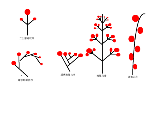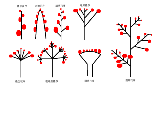 花序可依發育的順序分為有限花序及無限花序。有限花序由花軸(莖)的頂端優先開始發育至基部,故其花軸不會無限延長,故稱為有限花序,花朵由上向下或由內向外開放。無限花序自花軸基部優先開始發育至頂端,故其花軸可無限延長,稱為無限花序,花自花軸基部由下向上或由外向內開放。常見的有限花序為單頂花序、聚繖花序、複聚繖花序、變形聚繖花序。常見的無限花序則有總狀花序、複總狀花序/圓錐花序、圓錐狀、繖房花序、繖形花序、複繖形花序、穗狀花序、複穗狀花序、葇荑花序、頭狀花序、肉穗花序、隱頭花序(圖二、三)。