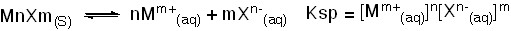 Ksp 稱為「溶解度積常數(Solubility product)」,用來判斷鹽類在溶劑中的溶解難易度,Ksp 越大的鹽類,其溶解度越好。如果是非一價離子的鹽類,式五修正為: