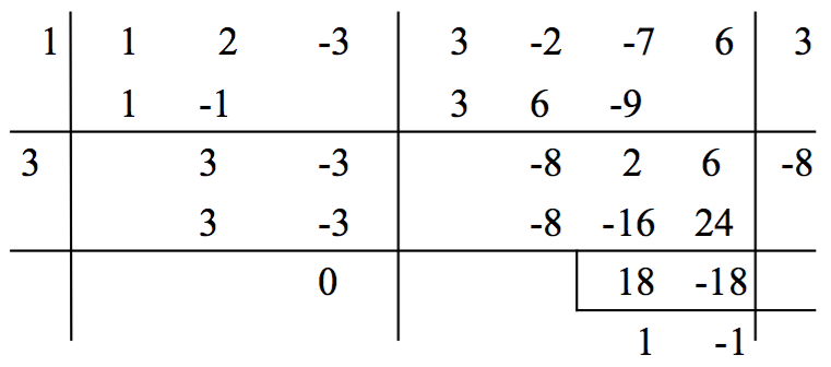 例題:求多項式 $$f(x)=x^2+2x-3$$ 與 $$g(x)=3x^3-2x^2-7x+6$$ 的最高公因式(H.C.F.)= 。