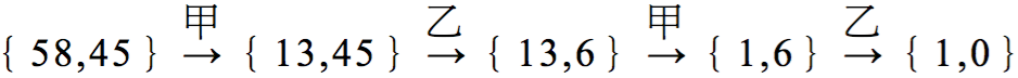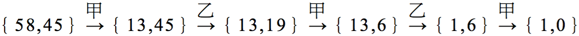 所以,假使甲、乙兩人比賽,分別寫出 $$58$$ 與 $$45$$ 兩個數,假設由甲先開始,整個對局的過程可能是: