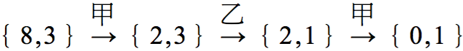 由上述情形,兩人對局時,不論先者或後者都有機會獲勝。因此,最值得關心的問題是:若 $$\{a,b\}(a>b)$$ 狀態後為 $$\{a’,b’\}(a'<b)$$,是否有必勝的絕招?先手必勝嗎?且看下面例子的說明: