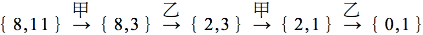 從畢氏求音律的輾轉相減法,若每次減盡,則稱為歐幾里得輾轉相除法,歐幾里得是希臘的數學家,曾任教於亞歷山大學院,輾轉相除法告訴我們:給定兩個正整數 $$a$$、$$b$$,在有限且規律的步驟裏,可以算出他們的最大公因數。一個有趣的遊戲很自然的發生了,這個遊戲我們稱為歐氏遊戲(Euclidean game),這是兩人玩的數學遊戲,比賽規則如下: