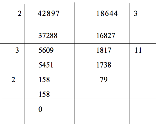 $$\therefore \left( {42897,18644} \right) = \left( {18644,5609} \right) = \left( {5609,1817} \right) = \left( {1817,158} \right) = \left( {158,79} \right) = \left( {79,0} \right) = 79$$