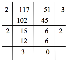 因此 $$(117,51)=(51,15)=(15,6)=3$$