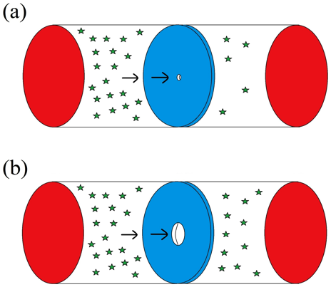 圖一 逸散現象和擴散現象的示意圖。氣體分子從容器左邊經由孔洞流到容器右邊。(a)孔洞的直徑小於氣體的平均自由徑$$(D<l)$$,為逸散現象。(b) 孔洞的直徑大於氣體的平均自由徑$$(D>l)$$,為擴散現象。(作者繪圖)