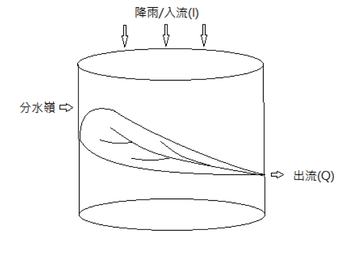 對於一個集水區而言,它可以簡單的被視為是一個裝水的容器(圖一),其下方有孔隙可以讓水流出。在一個集水區面積範圍上之降雨為它的入流 (I),而水流流過匯集的點繼續向下流則為出流 (Q)。入流減去出流 (I-Q)就會變成這個地區一定時間內儲存的水量 (S)。入流和出流兩者除了都與時間有關之外,入流也會影響到出流。透過降雨數據取得入流 (I),以及觀察研究推測出不同的出流(Q),對於集水區可以有幾種不同的應用,加入一些參數則可以延伸至水庫分析,災害防治,以及其他如灌溉測算等等。