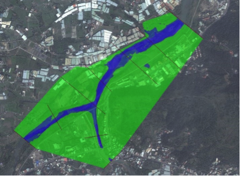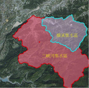 今天如果想要在三峽河下游(與橫溪交界處)蓋一堰來舒緩石門水庫缺水對新北地區造成之影響,首先需要的就是兩河流集水區的資料。透過現有資料與城市的輔助,可以找出兩集水區之面積,並且疊圖在地圖上以方便理解(圖二)。透過面積配合年雨量資料就可以得到上述的入流 (I)。其後,如果想知道在堰完成後嚴重水災來襲時對上游地區之影響,可以先循歷史資料找出洪水頻率,再藉由軟體分析帶入河道與地形資料進行水位模擬。隨後就可以得到如在 100 年洪水下水位上升的情形跟淹沒區域增加的狀況(圖三),進行疊圖後就可以確認受影響住宅、工廠。藉此,在建設前可以成為安全評估的依據,建設後也可以作為災害疏散之標準。