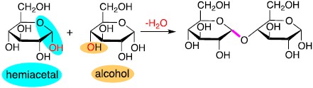 醣苷鍵的形成,其中一個單醣的提供半縮醛之官能基,此碳暫稱為1號碳,而另一個提供醇基的單醣則可已有至少兩個選擇,一般都是選擇與4號碳、6號碳上的醇 基和另一個單醣的半縮醛基反應,分別稱為「1, 4醣苷鍵 (1,4 glucosidic band)」和「1, 6醣苷鍵 (1,6 glucosidic band)」。由於1, 4醣苷鍵可為位於環的上方或下方,故可再分為α-linkage和β-linkage。