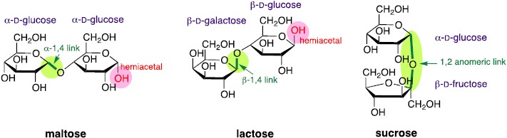 乳糖,是由一個β-D-半乳糖與一個D -葡萄糖,透過1,4 glucosidic bond連接。 因為D -葡萄糖有α-式還是β式,可分別得到α-乳糖以及β-乳糖。人體內僅有α-乳糖的乳糖水解酶,沒有β-乳糖的乳糖水解酶;雖然它們兩者可以緩慢轉換,然 而大多數人的乳糖水解酶的活性仍然會在斷奶後逐漸降低,這稱之為乳糖不耐症。
