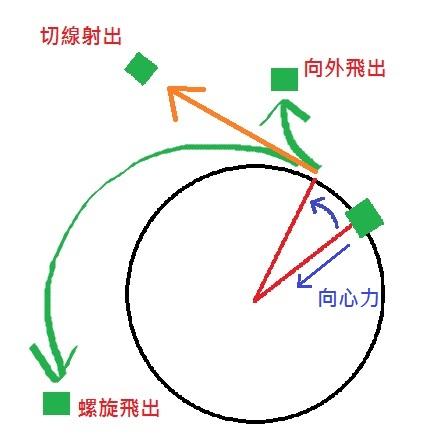 [註一] 如果此旋轉座標系是在有重力場的環境下,例如摩天輪在地表上,或在甩動的水桶,運行過程中,突然斷裂飛出的遊樂車,或水桶瞬間消失後剩下的水,將會走拋物線軌跡。