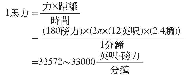 在瓦特最早的觀察中,$$1$$ 匹馬 $$1$$ 小時可以拖動半徑為 $$12$$ 英呎負重相當 $$180$$ 磅重的水車繞行 $$144$$ 圈,平均每分鐘繞行 $$2.4$$ 圈,由此關係定義出一匹馬的工作功率為